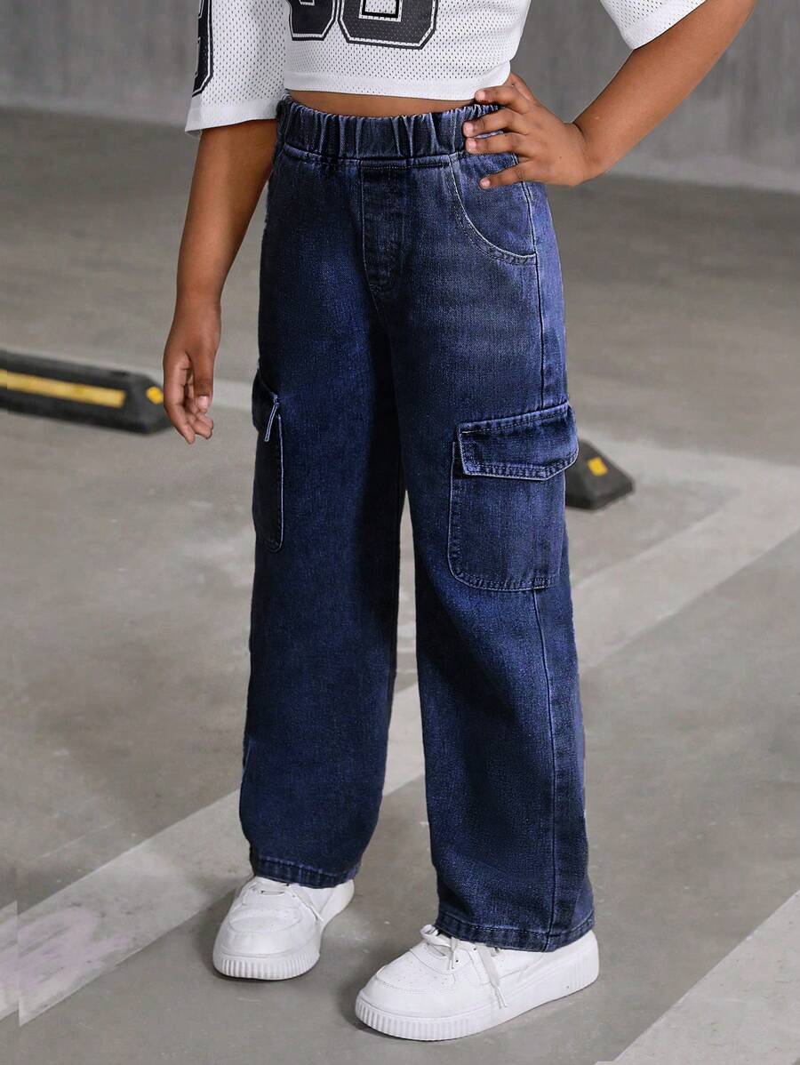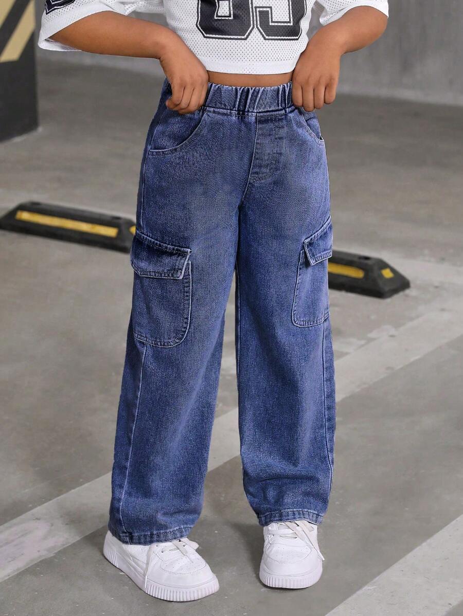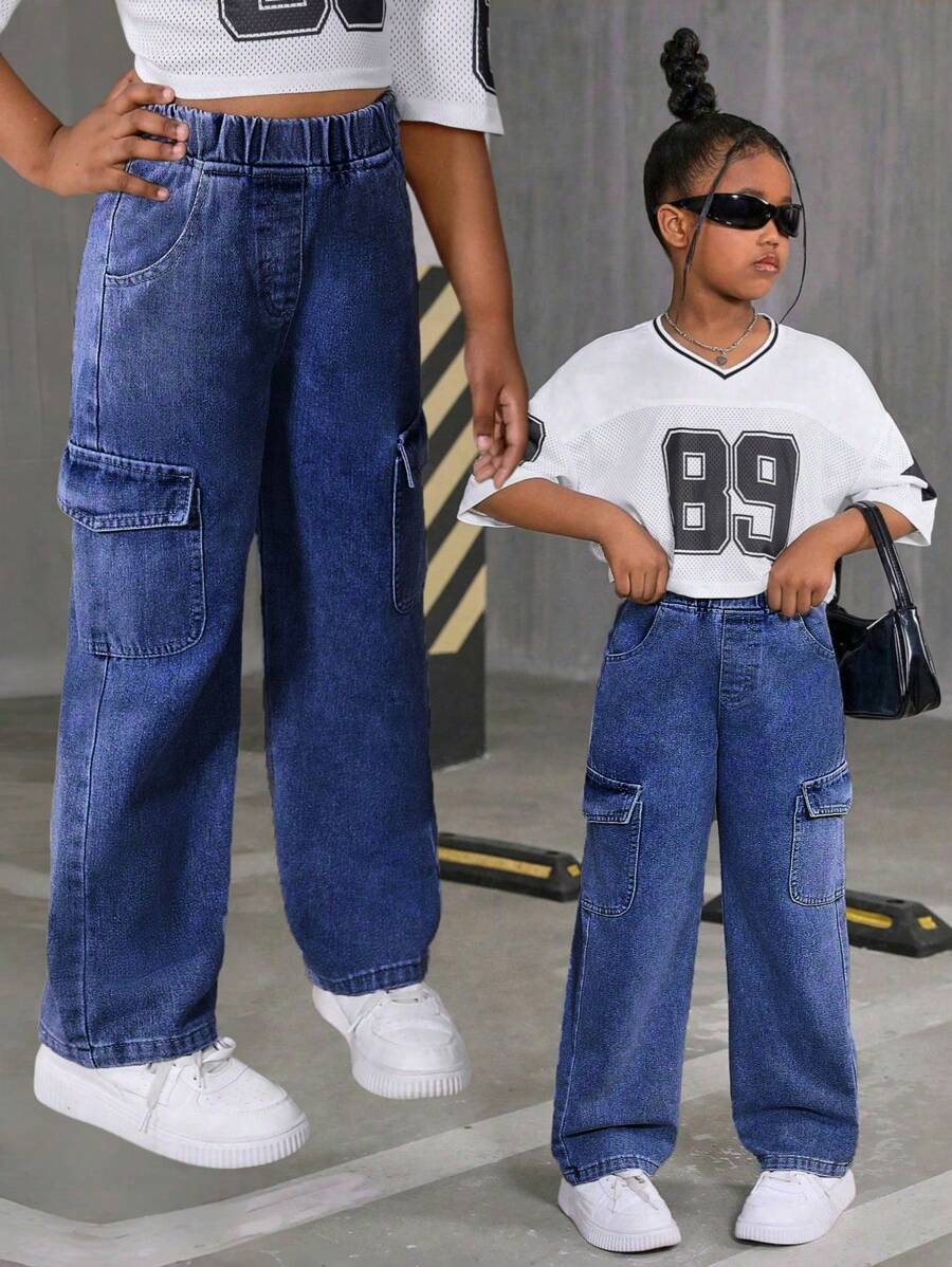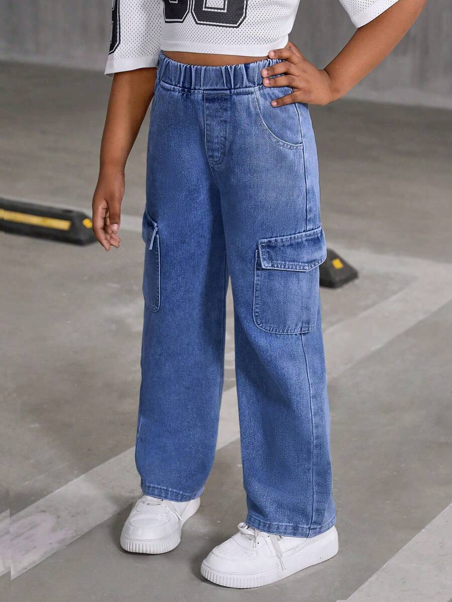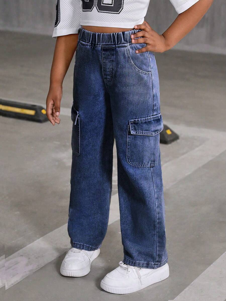 Girls Wide Leg Cargo Denim Jeans – Loose Fit Streetwear Casual Pants