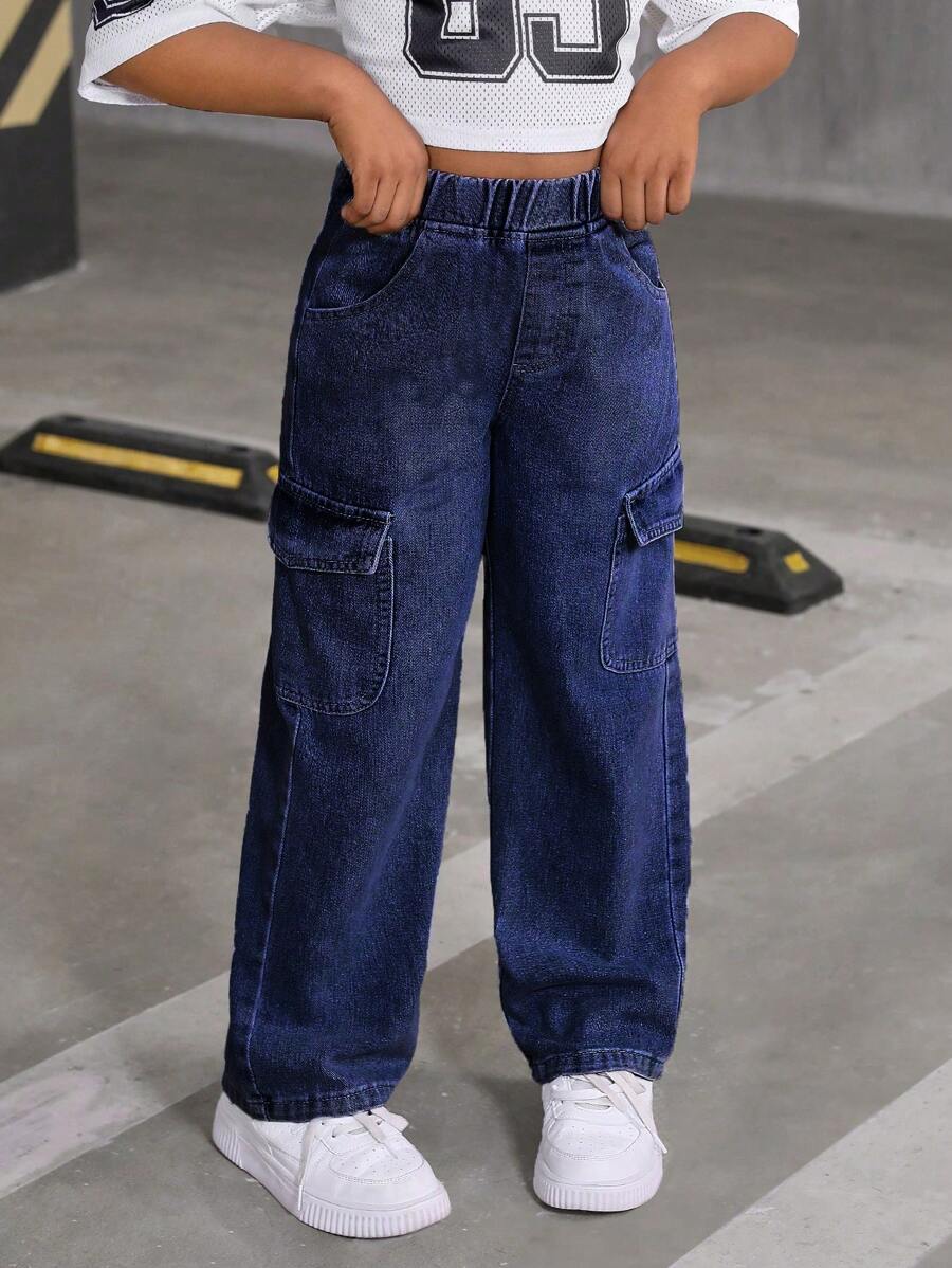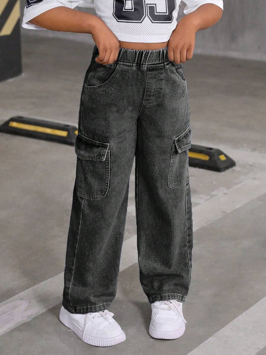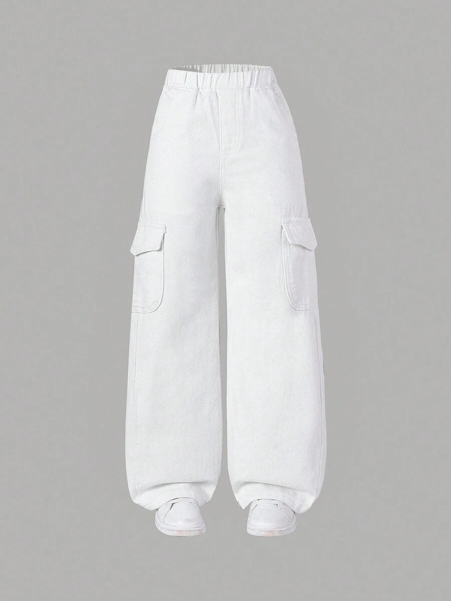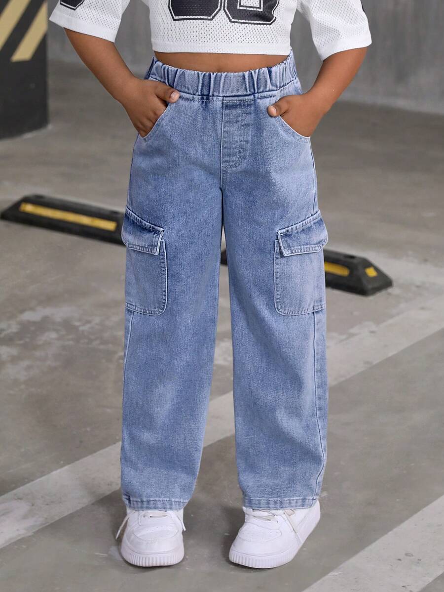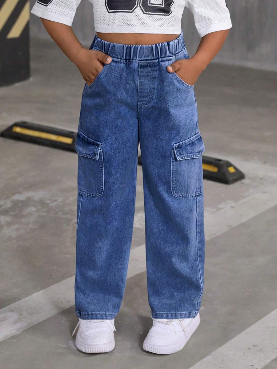 Girls Wide Leg Cargo Denim Jeans – Loose Fit Streetwear Casual Pants