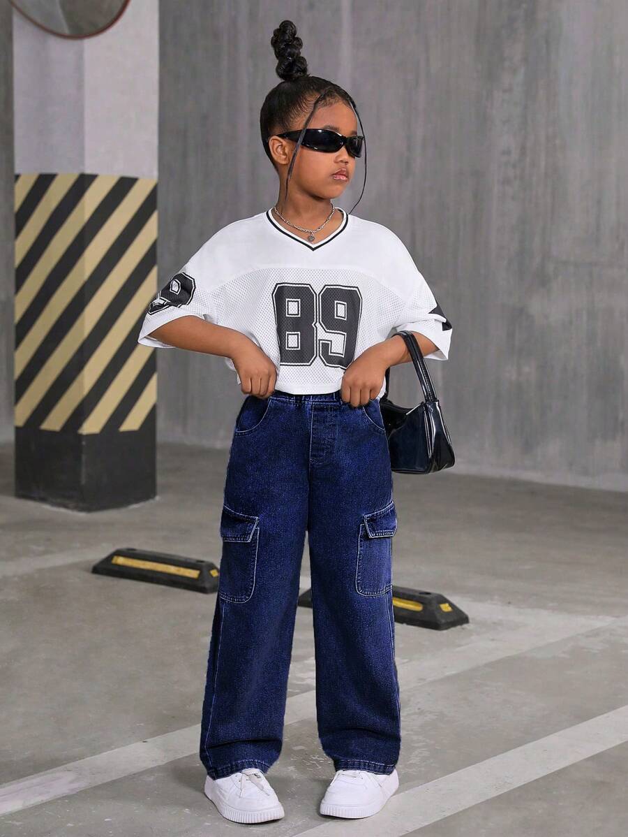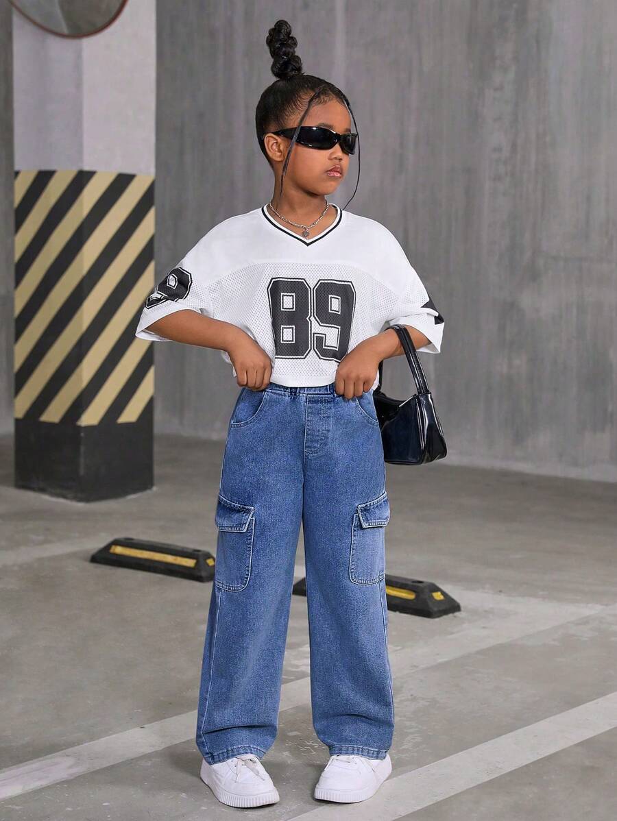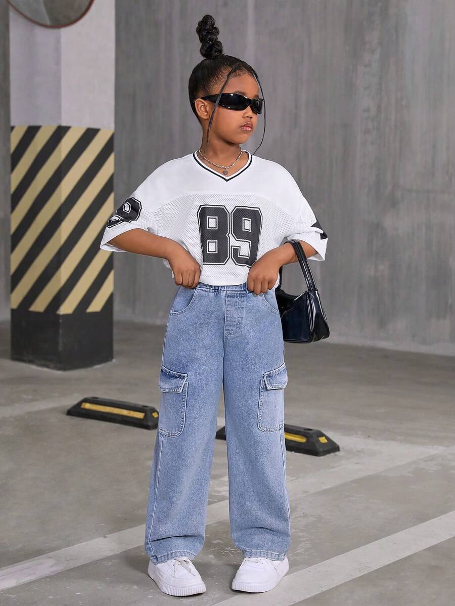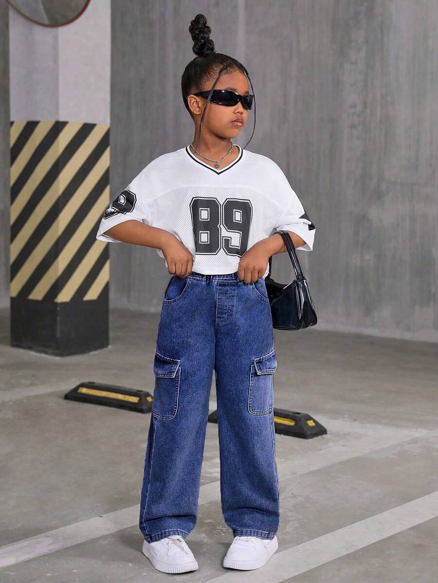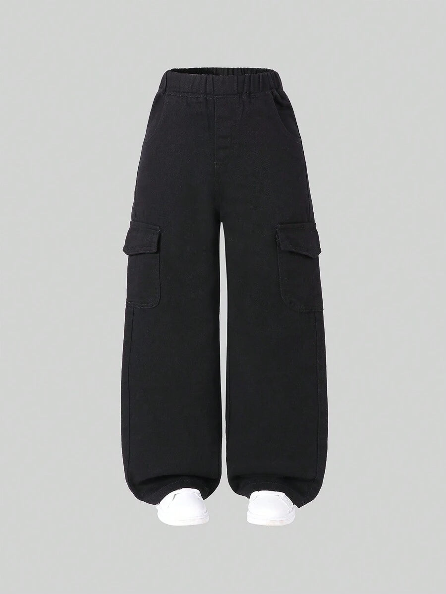Girls Wide Leg Cargo Denim Jeans – Loose Fit Streetwear Casual Pants